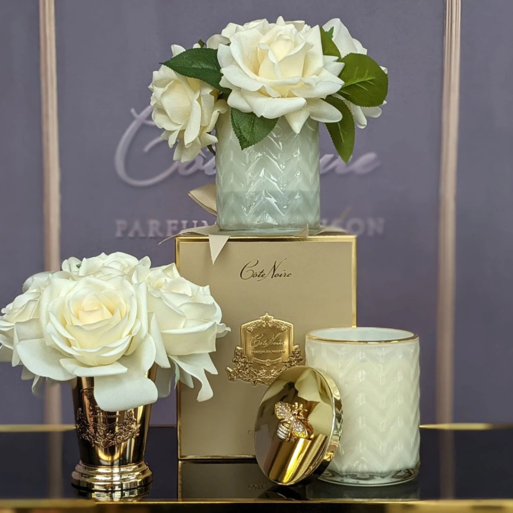 Weighing 600g, the Herringbone Cote Noire scented candle is equipped with double cotton wicks to ensure a clean and even burn, allowing the full-bodied fragrance of Blonde Vanilla to fill your space. The candle also features a decorative bee and gold lid, adding a touch of opulence to its design. Once the candle has been fully enjoyed, the beautiful herringbone glass vessel can be repurposed, serving as a lasting memento of the luxurious experience.