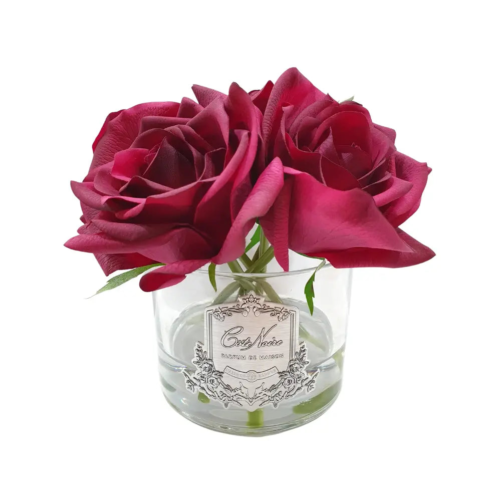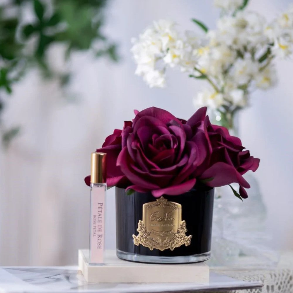 The vibrant carmine red of these roses adds a bold touch of colour, embodying passion and sophistication in every petal. Designed to look and feel like real roses, this arrangement captures the essence of natural beauty while delivering a luxurious scent that lingers. Ideal for creating a focal point in any room, the Cote Noire Carmine Red roses are a testament to refined taste, perfect for those who appreciate the finer things in life.