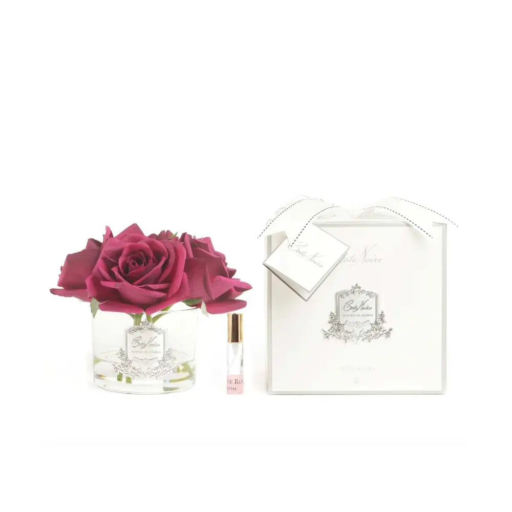 Elevate your living space with the captivating allure of the Cote Noire Perfumed Natural Touch Five Roses in Carmine Red. This exquisite floral diffuser set includes five meticulously crafted roses, each infused with a sumptuous fragrance that fills your room with elegance and charm.