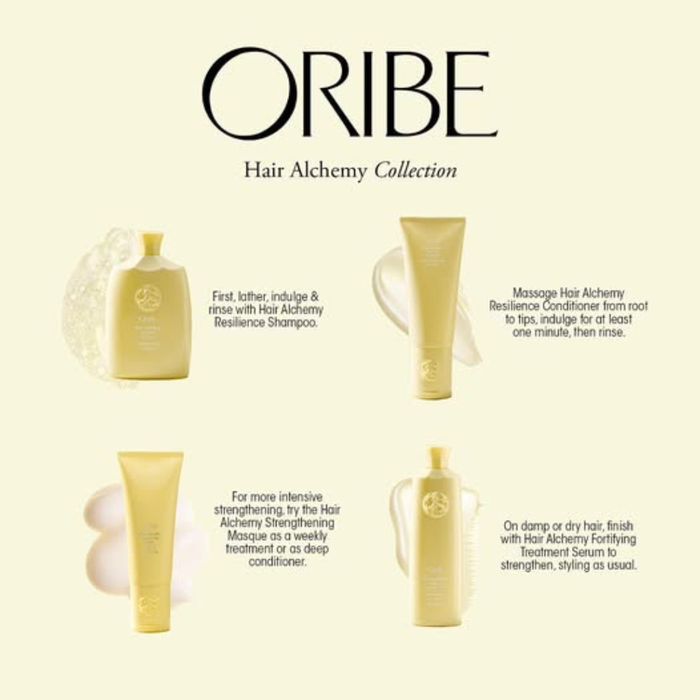 - Apply a small amount of Oribe Hair Alchemy Fortifying Treatment Serum to damp hair from mid-lengths to ends.