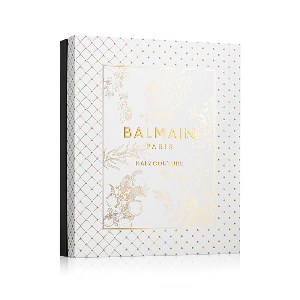A complete Balmain Hair Couture routine designed to cleanse, hydrate, repair and refine the hair from start to finish. This luxurious edit includes both care essentials and styling icons — crafted to restore softness, protect colour, improve shine and elevate everyday styling with the signature Balmain couture finish. Presented in an embossed white and gold Balmain Paris gift box, this set is the ultimate introduction to the Balmain Hair experience.
