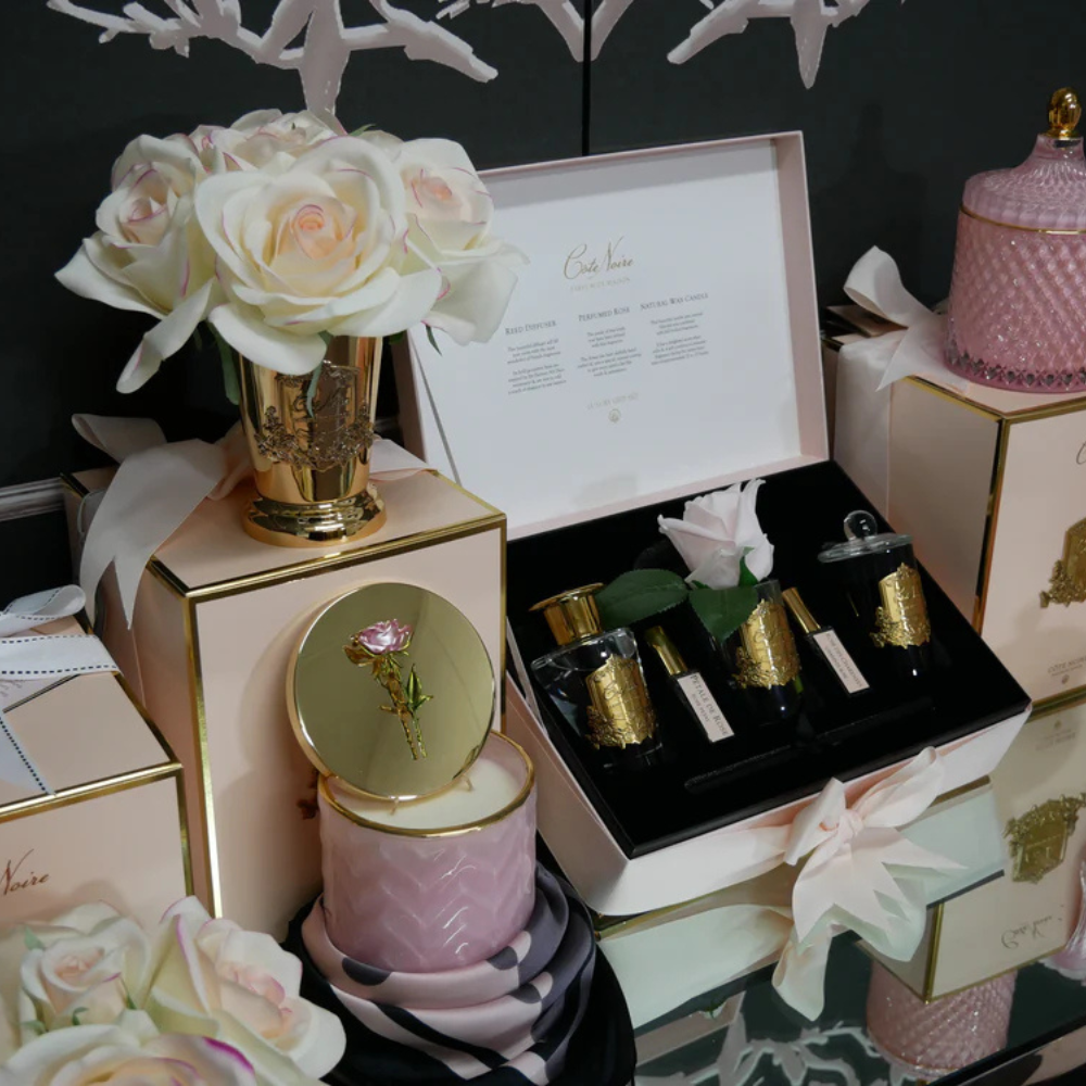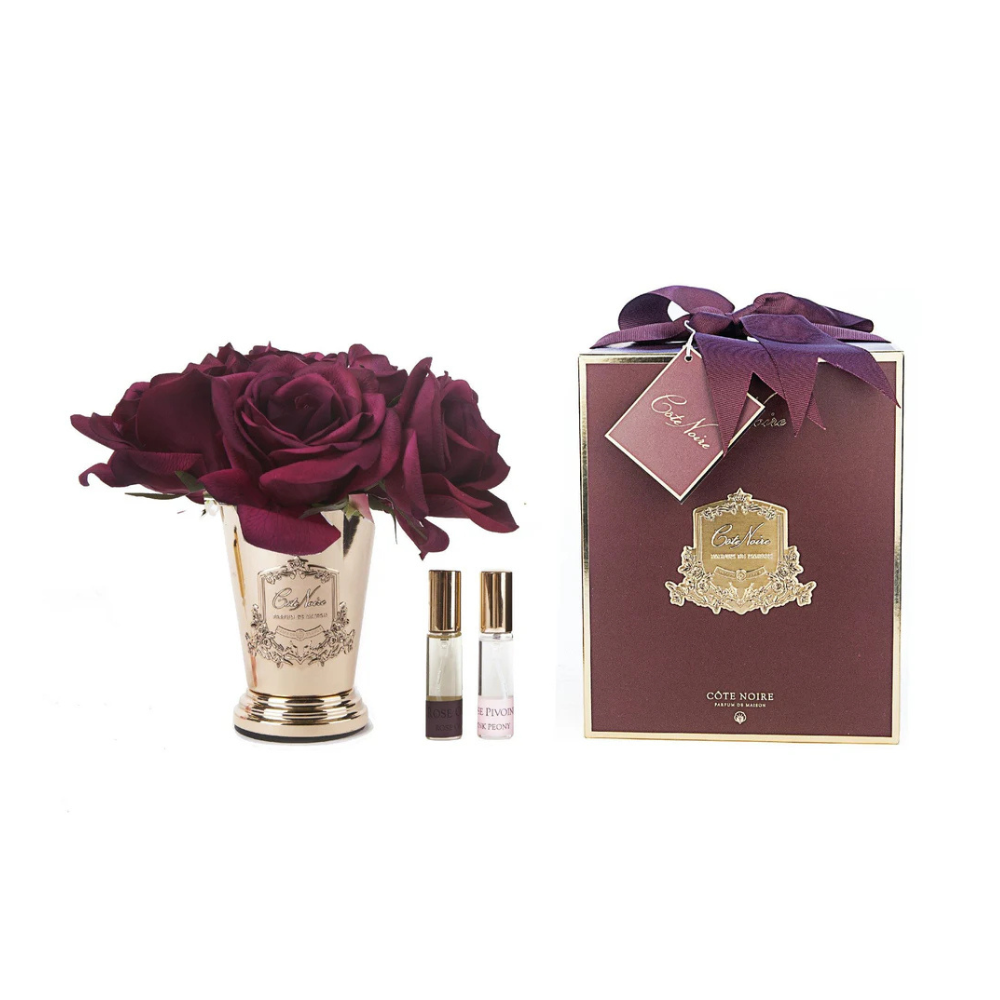 The vibrant carmine red of these roses adds a bold touch of colour, embodying passion and sophistication in every petal. Designed to look and feel like real roses, this arrangement captures the essence of natural beauty while delivering a luxurious scent that lingers. Ideal for creating a focal point in any room, the Cote Noire Magneta roses are a testament to refined taste, perfect for those who appreciate the finer things in life.