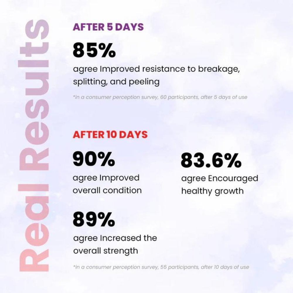 突破性的多聚合技术技术有助于在使用时增强指甲的强韧度,并且透过持续使用,这种强化配方可以帮助修復脆弱、易碎或受损的指甲。