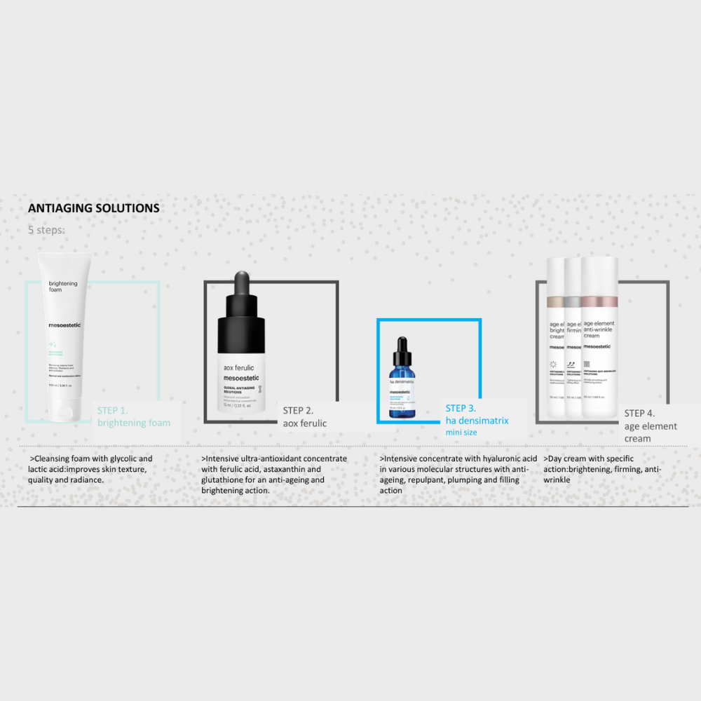 - minisize ha densimatrix: hyaluronic acid serum or concentrate that provides a moisturising, anti-ageing, repulping and filling action. It helps to promote hydration and supple skin, prevent dehydration and protect against premature ageing. 5 ml.
