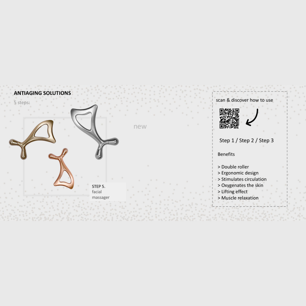 - Dual facial massager roller: it promotes the absorption of active ingredients, activates microcirculation and has a toning, firming and revitalising effect.